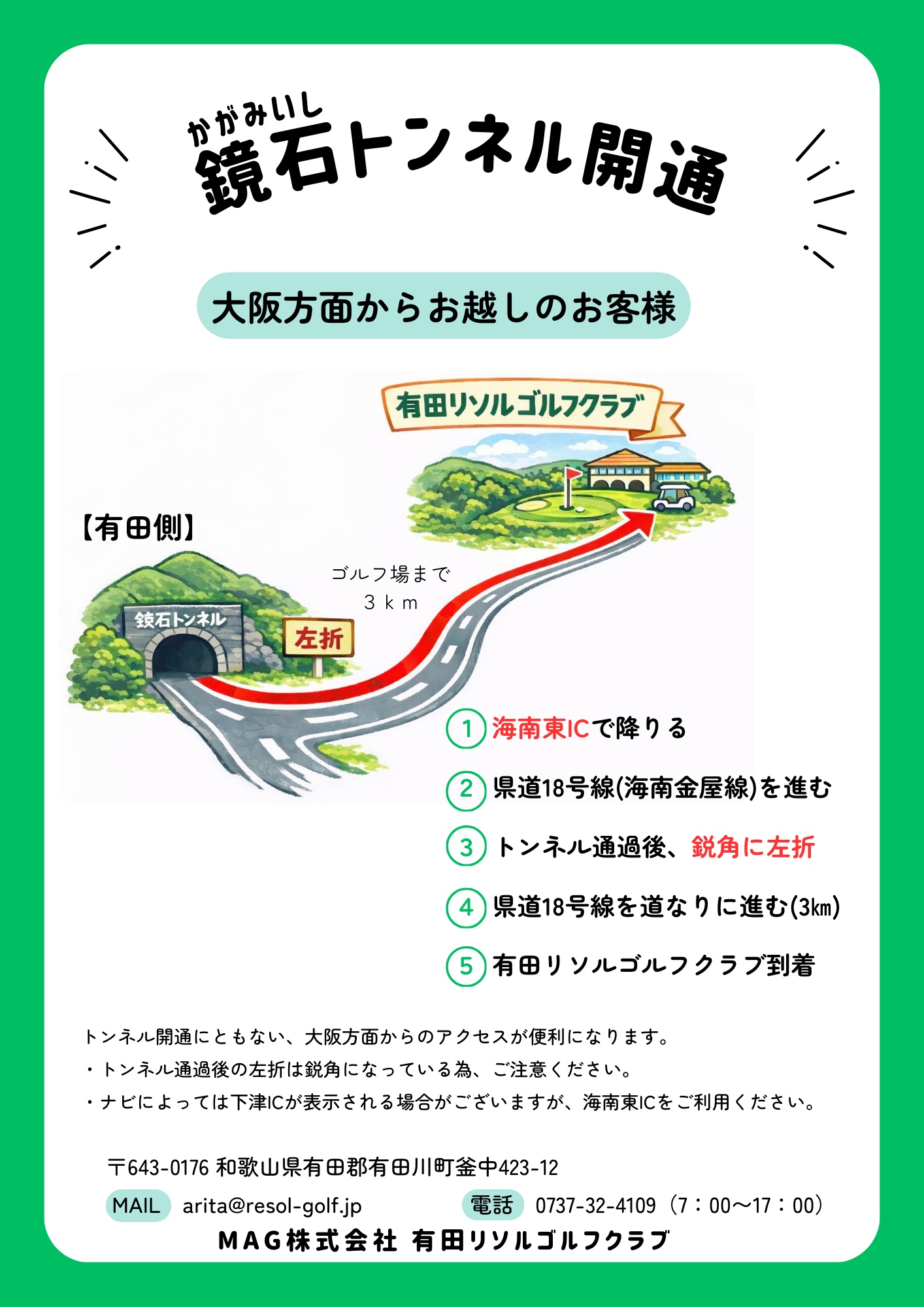 - 2026.01.18 2026年1月18日15時より、県道18号海南金屋線 改良区間内「鏡石トンネル」が開通致しました。大阪方面からお越しのお客様は、アクセスが便利になります。ご利用の際は、走行に十分ご注意いただきご来場下さいますようお願い致します。